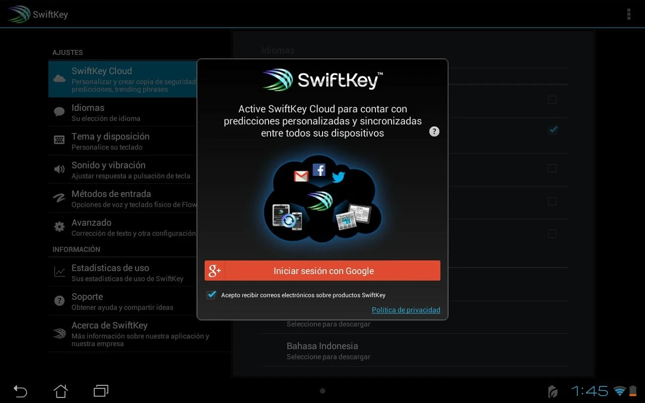 - Enseña a SwiftKey tu forma de escribir basada en el lenguaje que utilizas en Facebook, Gmail, Twitter, Yahoo, SMS y blogs.